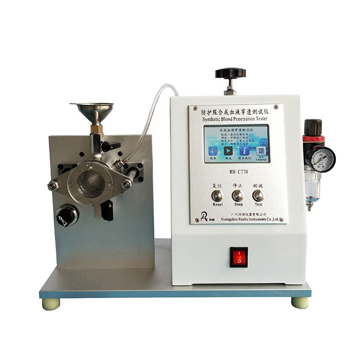 RH-CT70防护服合成血液穿透测试仪用于合成血液等液源性液体喷射穿透性能的测定,以评估其安全防护性能。适用于防护服材料合成血喷溅穿透性能的测定。广泛地应用于医药检验部门、安全检测部门和科研单位实验之用